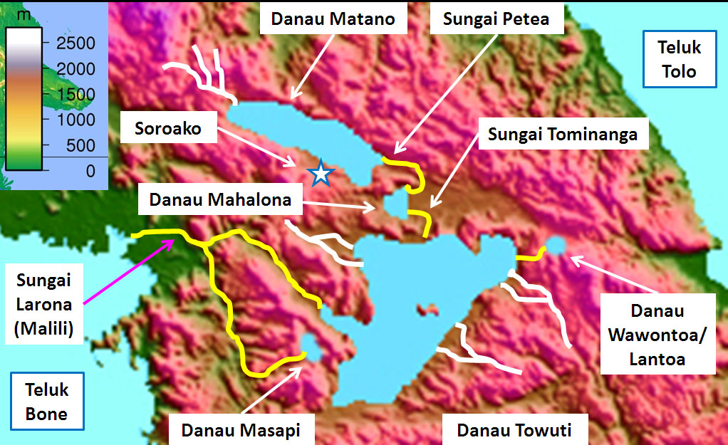 Perbedaan ketinggian pada tiap danau, menyebabkan dimungkinkannya aliran air dari danau yang letaknya lebih tinggi menuju ke danau yang lebih rendah. Air dari Danau Matano mengalir ke Danau Mahalona melalui Sungai Petea. Selanjutnya air dari Danau Mahalona mengalir ke Danau Towuti melalui Sungai Tominanga, sedangkan air ari Danau Towuti keluar melalui Sungai Larona (Malili) yang bermuara di Teluk Bone. Dua danau satelit kecil, yakni Danau Wawontoa dan Danau Masapi tidak berhubungan langsung dalam sistem sungai ini. Danau Masapi mengalir tersendiri ke Danau Larona/Malili